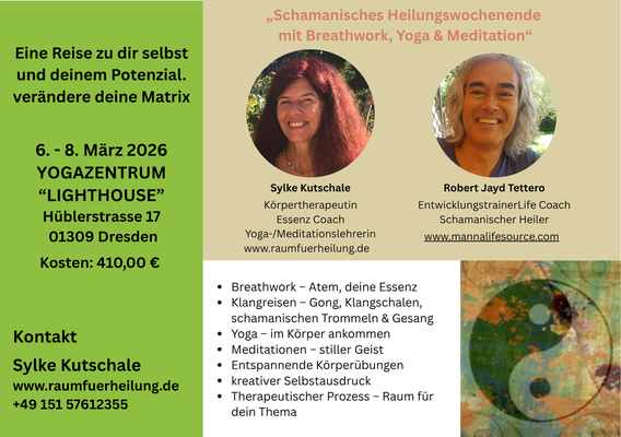 Die Kombination aus Yoga, Meditation, schamanischen Trommeln & Gesang, Coaching und intensiver Atemarbeit macht dieses Seminar zu einem unvergesslichen Erlebniswochenende. Bringe dein eigenes Thema für Veränderung mit. Erfahre, wie die Arbeit mit den verschiedenen Elementen dich auf deinem Heilungsweg stärkt und dir praktische Lösungen für deine Herausforderungen bietet. So kannst du deine Entschlossenheit, Resilienz und innere Stärke fördern – für ein erfüllteres und bedeutungsvolleres Leben. Nutze die Gelegenheit, Teil einer fröhlichen, liebevollen, unterstützenden und kreativen Community zu werden. Warte nicht länger – triff die Entscheidung und sei dabei!